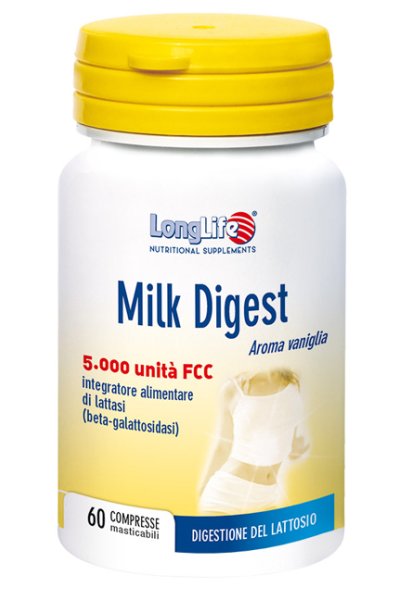 Integratore alimentare di lattasi con 5.000 unità di beta-galattossidasi per la digestione del lattosio, in compresse masticabili. Adatto a vegetariani e vegani.