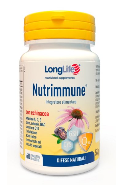 Agente di carica (calcio fosfato bibasico), echinacea 100 mg (Echinacea angustifolia DC.) radice tit. 4% (4 mg) echinacosidi, acido L-ascorbico (vitamina C 90 mg 112% VNR*), bioflavonoidi 37,5 mg, zinco picolinato (zinco 7,5 mg 75% VNR*), Betatene-D. salina tit. 10% beta-carotene 6 mg, antiagglomerante (acido stearico), addensante (carbossimetilcellulosa di sodio), noni 25 mg (Moringa citrifolia L.) frutto concentrato 10% (2,5 mg) polisaccaridi, ginseng 25 mg (Panax ginseng) radice e.s. 8% (2 mg) ginsenosidi, astragalo 25 mg (Astragalus membranaceus L.) foglia 4:1, timo 25 mg (Thymus vulgaris L.) foglia 4:1, D-alfa-tocoferil succinato (vitamna E 15 mg 125% VNR*), NAC 15 mg, complesso di folati (acido folico 150 mcg 75% VNR*), L-seleniometionina (selenio 50 mcg 90% VNR*), tè verde 10 mg (Camellia sinensis Kuntze) foglia 80% (8 mg) polifenoli, antiagglomerante (magnesio stearato vegetale), uva rossa semi 5 mg (Vitis vinifera L.) 95% (4,75 mg) polifenoli totali, Pycnogenol 5 mg (Pinus pinaster) corteccia 65% (3,25 mg) procianidine, L-glutatione ridotto 3 mg, coenzima Q10 2,5 mg, bistorta giapponese 1 mg (Polygonum cuspidatum, Siebold & Zucc.) radice e.s. 50% (0,5 mg) trans-resveratrolo, retinil palmitate (vitamina A 240 mcg 30% VNR*), agenti di rivestimento (idrossipropilmetilcellulosa e glicerolo).