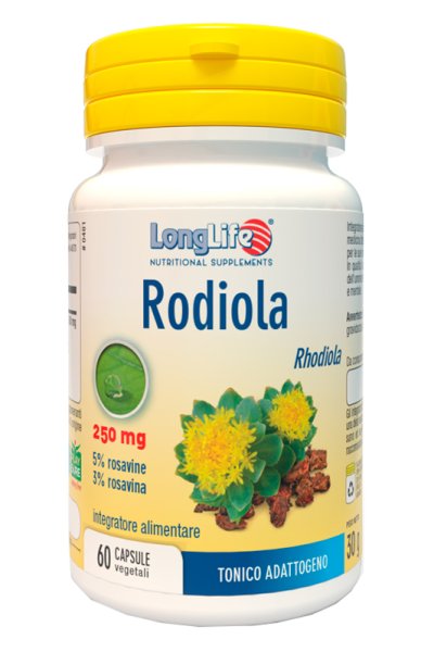 Integratore alimentare di rodiola titolato al 3% in rosavina, tonico-adattogeno utile per la stanchezza psicofisica e il normale tono dell'umore. Adatto ai vegetariani.