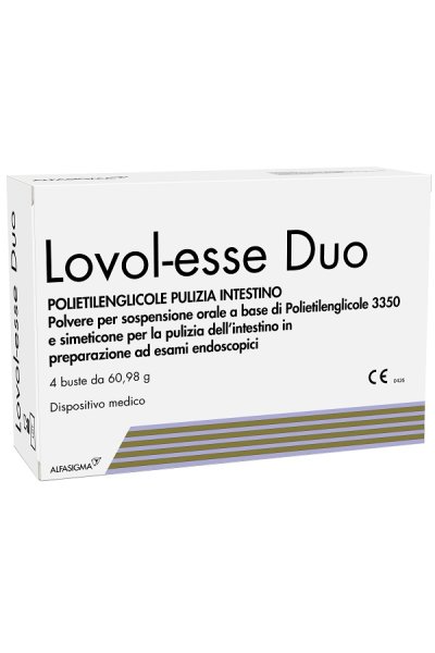 Lovol-esse Duo contiene polietilenglicole 3350, una sostanza inerte che non viene assorbita dall’intestino, non irrita la mucosa, non fermenta e viene escreta invariata dal tratto digestivo. Il Polietilenglicole 3.350 attira una grande quantità di acqua che provoca ammorbidimento della massa fecale stimolando la naturale peristalsi intestinale.