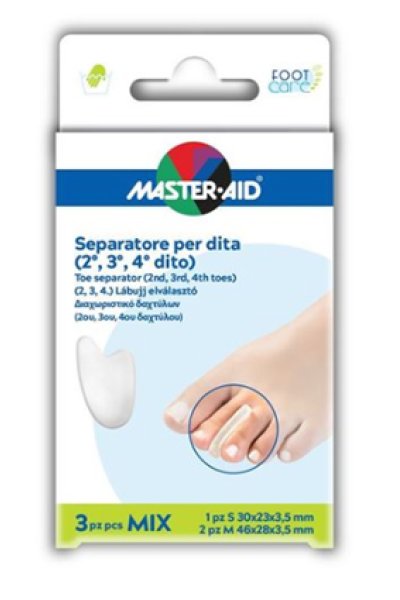 Separatore in gel per secondo, terzo e quarto dito del piede. Studiato per prevenire il dolore e le lesioni provocate dallo sfregamento tra le dita.