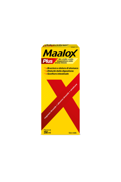 PosologiaPosologia Ingerire 2–4 cucchiaini di sospensione orale 4 volte al giorno, 20–60 minuti dopo i pasti e prima di coricarsi. Può essere diluito in acqua o latte. Non superare la dose massima indicata di 16 cucchiaini. Popolazione pediatrica MAALOX PLUS è controindicato nei bambini e negli adolescenti al di sotto dei 18 anni di età (vedere paragrafo 4.3). Modo di somministrazione Per uso orale. Agitare bene prima dell’uso.