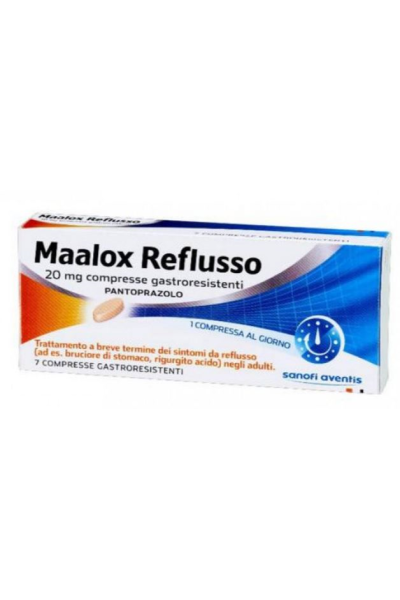 PosologiaPosologia La dose raccomandata è 20 mg di pantoprazolo (una compressa) al giorno. Potrebbe essere necessario assumere le compresse per 2–3 giorni consecutivi per ottenere un miglioramento dei sintomi. Una volta raggiunta la completa guarigione dei sintomi, il trattamento deve essere sospeso. Il trattamento non deve superare 4 settimane senza consultare un medico. Se entro 2 settimane di trattamento continuo non si nota alcun miglioramento dei sintomi, il paziente deve rivolgersi al medico. Popolazioni particolari Non è necessario l’aggiustamento della dose in pazienti anziani o in pazienti con compromissione renale o epatica. Popolazione pediatrica L’uso di MAALOX REFLUSSO non è raccomandato nei bambini e adolescenti al di sotto di 18 anni a causa della insufficienza di dati sulla sicurezza e sull’efficacia. Modo di somministrazione Le compresse gastroresistenti di MAALOX REFLUSSO 20 mg non devono essere masticate o frantumate, e devono essere deglutite intere con del liquido prima del pasto.