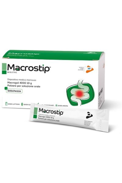 Prodotto ad azione lassativa che, grazie al meccanismo osmotico, regolarizza le funzioni intestinali. Non viene assorbito, né fermenta nell'intestino, non irrita la mucosa e viene eliminato nelle feci in forma non modificata. Grazie infatti alla sua affinità per l'acqua Macrostip bustine ammorbidisce le feci facilitando l'evacuazione. La sua azione non si riduce nel tempo.