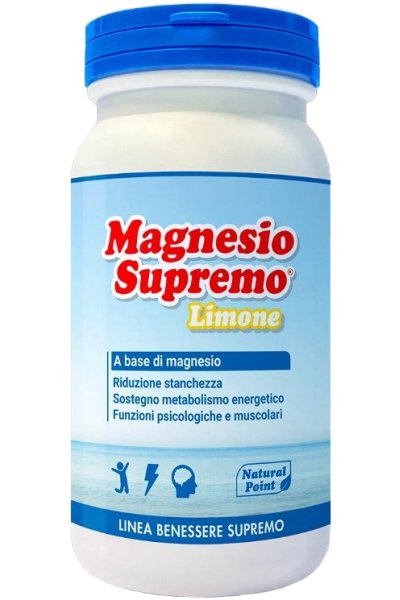 Magnesio Supremo Lemon, marchio registrato di Natural Point, è un integratore alimentare di magnesio, minerale utile per contrastare stanchezza e affaticamento specialmente nei periodi di maggiore stress psico-fisico. Il magnesio inoltre sostiene il fisiologico funzionamento della muscolatura e del sistema nervoso.