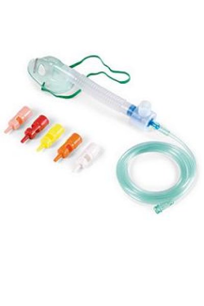Dispositivo medico CE, classe IIb.Maschera morbida a concentrazione variabile con sistema venturi - pediatrica. Completa di 6 raccordi colorati e tubo di collegamento antischiacciamento.