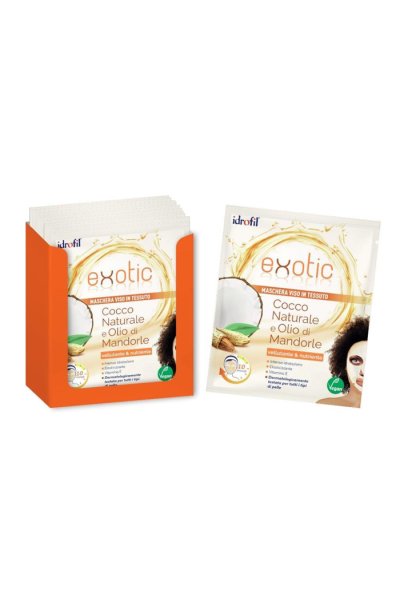 Maschera per il viso in tessuto, con cocco naturale e olio di mandorle, effetto vellutante e nutriente.