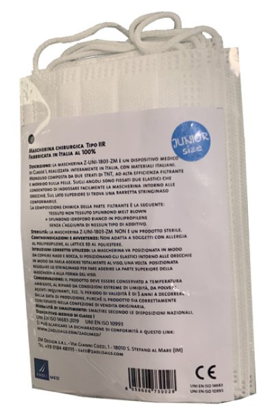 La mascherina Z-UNI-1803-ZM è un dispositivo medico di Classe I, realizzata interamente in Italia, con materiali italiani. Monouso composta da due strati di TNT, ad alta efficienza filtrante e morbido sulla pelle. Sugli angoli sono fissati due elastici che consentono di indossare facilmente la maschera intorno alle orecchie. Sul lato superiore si trova una barretta stringinaso conformabile.