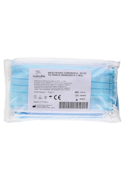 Maschera facciale a 3 veli (Tessuto non tessuto Spun-Bond, Melt-blown, tessuto non tessuto Spun-Bond) in grado di garantire una barriera che limita la trasmissione di agenti infettivi. La mascherina oltre alla capacità di filtraggio è dotata di una buona vestibilità, i comodi elastici assicurano che la mascherina aderisca ai lati della faccia e lo strato a contatto con la pelle è morbido e non abrasivo. La Mascherina Chirurgica Gammadis è un dispositivo medico, monouso, non sterile, idoneo per coprire naso, bocca e mento. Sono destinate all'uso da parte di operatori sanitari per protezione da possibili contatti con liquidi/aerosol potenzialmente contaminate. Si indossa fissando gli elastici intorno alle orecchie, al fine di limitare la trasmissione di agenti infettivi. Colore: bianche, blu, verdi. Misure: 17,5 cm x 9,5 cm.