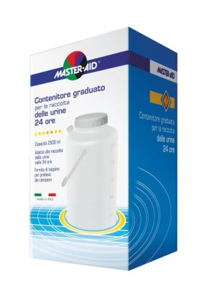 Prodotto a tanica, per la raccolta delle urine nelle 24 ore, con scala graduata, coperchio a vite, tappo per il prelievo.