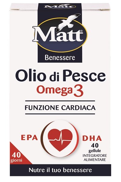 Olio di Pesce Omega 3 Matt è un integratore di acidi grassi polinsaturi della serie omega 3 (EPA/DHA) utile per apportare una quota integrativa di tali nutrienti. EPA e DHA contribuiscono alla normale funzione cardiaca.