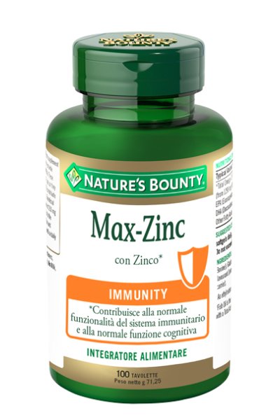 Max-Zinc è un integratore alimentare a base di zinco. Lo zinco contribuisce alla normale funzionalità del sistema immunitario, alla protezione delle cellule dallo stress ossidativo e alla normale funzione cognitiva. Inoltre contribuisce al normale metabolismo dei macronutrienti, come carboidrati e acidi grassi, e alla normale sintesi delle proteine. Infine contribuisce alla normale fertilità e riproduzione e a conservare pelle, capelli e unghie normali.