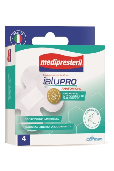 Confezione contenente 4 medicazioni pronte all’uso anatomiche per articolazioni misura 10x10 cm.