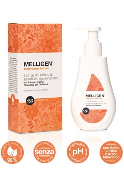 Melligen è un dispositivo medico per l'igiene intima dei soggetti diabetici che, grazie alla sua formulazione arricchita con acido lattico e sodio ialuronato, deterge con delicatezza e crea un efficace effetto barriera specifico per la mucosa nei casi di secchezza vulvovaginale, bruciori, pruriti e predisposizioni alle irritazioni.