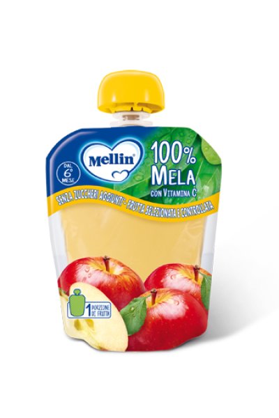 Merenda pastorizzata a base di purea di frutta, senza zuccheri aggiunti, con frutta selezionata e controllata.