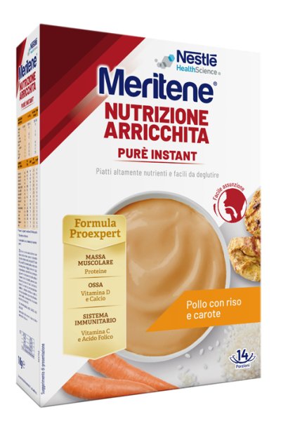 Ogni cucchiaio di Meritene PURÈ INSTANT fornisce tutti i nutrienti necessari per un pasto bilanciato adatto alle persone con problemi di masticazione e deglutizione o con fabbisogni nutrizionali aumentati.