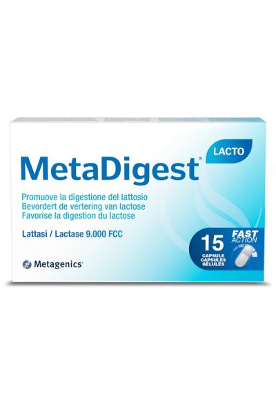 Integratore a base di lattasi appositamente formulato per favorire la digestione del lattosio nei soggetti che mal digeriscono il lattosio di latte, formaggi o altri alimenti. Il dosaggio dell'enzima è molto elevato: 9.000 unita FCC per permettere una efficace e completa digestione enzimatica dello zucchero. Viene utilizzata una lattasi di origine fungina estratta dall'Aspergillus Oryzae la cui azione si esplica in un ampio range di pH (2-10). MetaDigest Lacto comincia la sua azione già nello stomaco. L'enzima utilizzato è ultra purificato e ad alta attività biologica. Senza soia e adatto ai vegetariani.