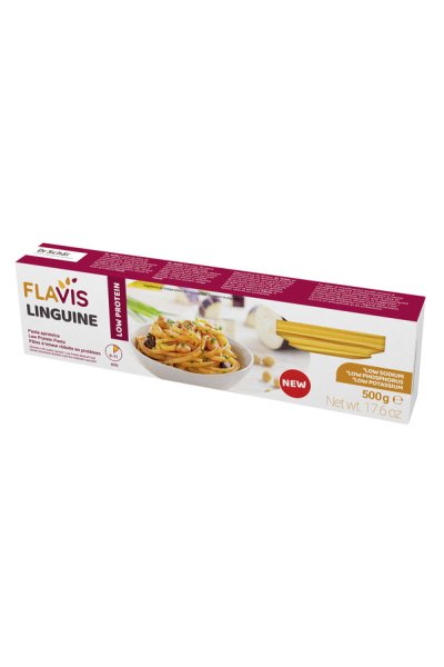 Linguine studiate appositamente per chi deve seguire una dieta a basso contenuto di proteine. Prodotto con solo 0,5 g di proteine per 100 g; ricco in fibre 7,3 g per 100 g; povero in sodio, potassio e fosforo.