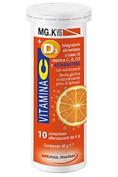 Integratore alimentare in pratiche compresse effervescenti a base di vitamina C, vitamina D3, vitamina A e astaxantina con edulcoranti.