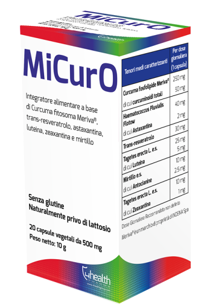 Integratore alimentare a base di curcuma fitosoma Meriva, trans-resveratrolo, astaxantina, luteina, zeaxantina e mirtillo.