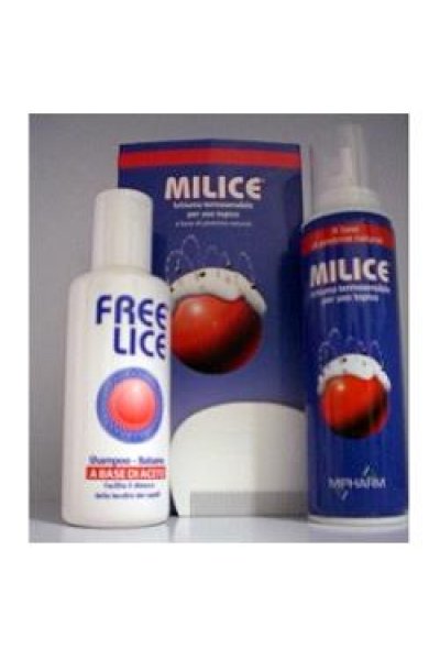 Trattamento anti pidocchi composto da schiuma e shampoo.- Milice schiuma: a base di pietrine naturali, è una formulazione topica con innovativa tecnologia di somministrazione, efficace contro uova e pidocchi. Schiuma comoda da applicare e ben accetta anche a bambini e ragazzi. Distribuita sulla zona e lievemente massaggiata, assume immediatamente una consistenza liquida per effetto del calore corporeo; ciò permette ai suoi principi attivi di raggiungere ogni punto della zona interessata e permanere a contatto con gli agenti infestanti, esplicando una completa ed efficace azione anche sulle uova depositate lungo i capelli ed i peli. Lasciate agire Milice per almeno 10 minuti, quindi lavate la zona trattata con un normale shampoo, per rimuovere i residui inerti dei parassiti.