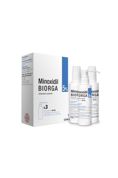 PosologiaPosologia La dose di 1 ml di soluzione cutanea al 5% di Minoxidil Biorga deve essere applicata sul cuoio capelluto due volte al giorno (una volta la mattina e una volta la sera). Questa dose deve essere somministrata a prescindere dalla dimensione dell’area interessata. La dose totale giornaliera non deve superare i 2 ml. Popolazione pediatrica e popolazione anziana Non è raccomandato sotto i 18 anni e sopra i 65 anni di età in considerazione della mancanza di dati sulla sicurezza e sull’efficacia. Modo di somministrazione La soluzione cutanea al 5% di Minoxidil Biorga è solo per uso esterno. Non è raccomandato sotto i 18 anni e sopra i 65 anni di età in considerazione della mancanza di dati sulla sicurezza e sull’efficacia. La soluzione cutanea al 5% di Minoxidil Biorga deve essere applicata seguendo le istruzioni e unicamente sul cuoio capelluto. La soluzione cutanea al 5% di Minoxidil Biorga deve essere applicata soltanto su capelli e cuoio capelluto asciutti. Dopo l’applicazione della soluzione cutanea al 5% di Minoxidil Biorga lavare bene le mani. Potrebbe essere necessario applicare il prodotto due volte al giorno per quattro o più mesi. In ogni caso, il medico deve valutare l’opportunità di interrompere il trattamento se non si osservano risultati entro 4 mesi. Se si osserva una ricrescita dei capelli, si deve proseguire l’applicazione della soluzione cutanea al 5% di Minoxidil Biorga due volte al giorno, per mantenerne gli effetti. Dopo la sospensione del trattamento topico con il minoxidil, sono stati occasionalmente segnalati l’interruzione della ricrescita dei capelli e il ritorno all’aspetto precedente nell’arco di 3–4 mesi dopo l’interruzione del trattamento.