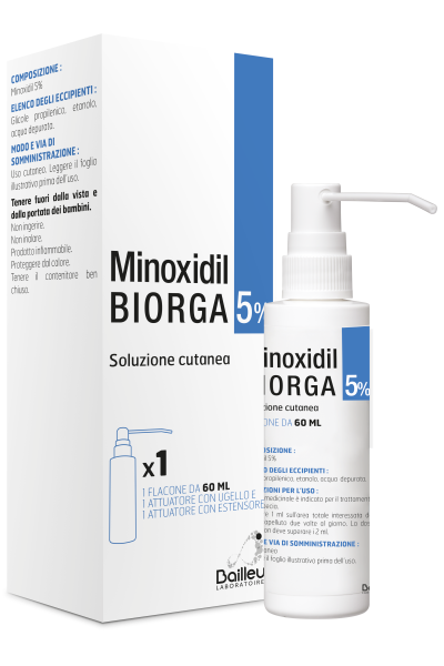 PosologiaPosologia La dose di 1 ml di soluzione cutanea al 5% di Minoxidil Biorga deve essere applicata sul cuoio capelluto due volte al giorno (una volta la mattina e una volta la sera). Questa dose deve essere somministrata a prescindere dalla dimensione dell’area interessata. La dose totale giornaliera non deve superare i 2 ml. Popolazione pediatrica e popolazione anziana Non è raccomandato sotto i 18 anni e sopra i 65 anni di età in considerazione della mancanza di dati sulla sicurezza e sull’efficacia. Modo di somministrazione La soluzione cutanea al 5% di Minoxidil Biorga è solo per uso esterno. Non è raccomandato sotto i 18 anni e sopra i 65 anni di età in considerazione della mancanza di dati sulla sicurezza e sull’efficacia. La soluzione cutanea al 5% di Minoxidil Biorga deve essere applicata seguendo le istruzioni e unicamente sul cuoio capelluto. La soluzione cutanea al 5% di Minoxidil Biorga deve essere applicata soltanto su capelli e cuoio capelluto asciutti. Dopo l’applicazione della soluzione cutanea al 5% di Minoxidil Biorga lavare bene le mani. Potrebbe essere necessario applicare il prodotto due volte al giorno per quattro o più mesi. In ogni caso, il medico deve valutare l’opportunità di interrompere il trattamento se non si osservano risultati entro 4 mesi. Se si osserva una ricrescita dei capelli, si deve proseguire l’applicazione della soluzione cutanea al 5% di Minoxidil Biorga due volte al giorno, per mantenerne gli effetti. Dopo la sospensione del trattamento topico con il minoxidil, sono stati occasionalmente segnalati l’interruzione della ricrescita dei capelli e il ritorno all’aspetto precedente nell’arco di 3–4 mesi dopo l’interruzione del trattamento.