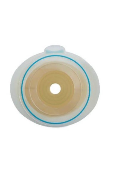 placca costituita da un adesivo a base idrocolloidale e da un anello flottante dotato di una guida per il corretto posizionamento della sacca di raccolta.