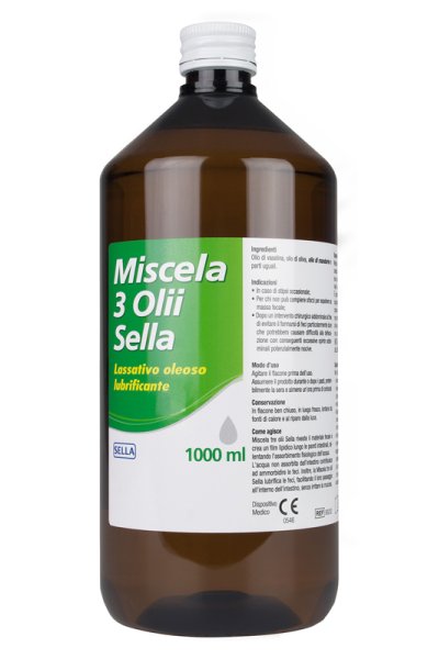 Miscela 3 Olii Sella riveste il materiale fecale e crea un film lipidico lungo le pareti intestinali, rallentando l'assorbimento fisiologico dell'acqua. L'acqua non assorbita dall'intestino contribuisce ad ammorbidire le feci. Inoltre, la Miscela 3 Olii Sella lubrifica le feci, facilitando il loro passaggio all'interno dell'intestino, senza irritare la mucosa.