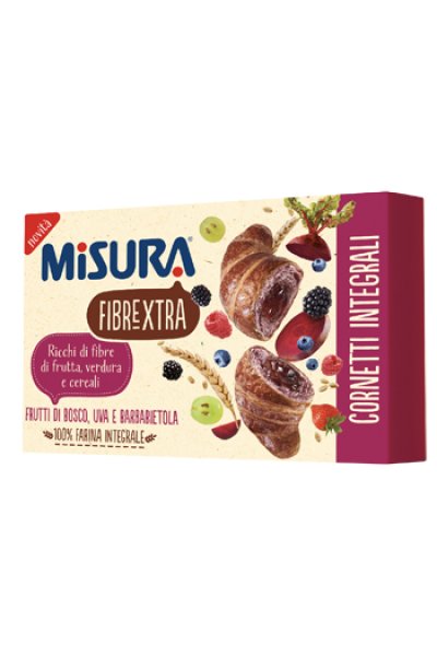 Selezione Fibrextra Misura 34% (farina di frumento integrale 31%, fibra solubile da amido di frumento 1,5%; fibra solubile: oligo-fruttosio 1,5%), farcitura alla frutta e verdura 24% [sciroppo di glucosio-fruttosio, zucchero, succo di barbabietola da concentrato 4%, puree di frutti di bosco 4% (ribes rosso, mora, mirtillo), fibra di cicoria 3%, succo d'uva da concentrato 1%, fibra di mela 0,3%; gelificante: pectina; acidificante: acido citrico, aroma naturale], olio e grassi vegetali non idrogenati (burro di karitè, girasole), lievito naturale 7% (frumento), zucchero, burro, uova fresche da galline allevate a terra; emulsionanti: mono e digliceridi degli acidi grassi di origine vegetale, lecitina di soia; tuorlo di uova fresche da galline allevate a terra; concentrato di: carota, ravanello, mela, ribes nero, ibisco; latte scremato in polvere, aromi, farina di frumento maltato, sale.