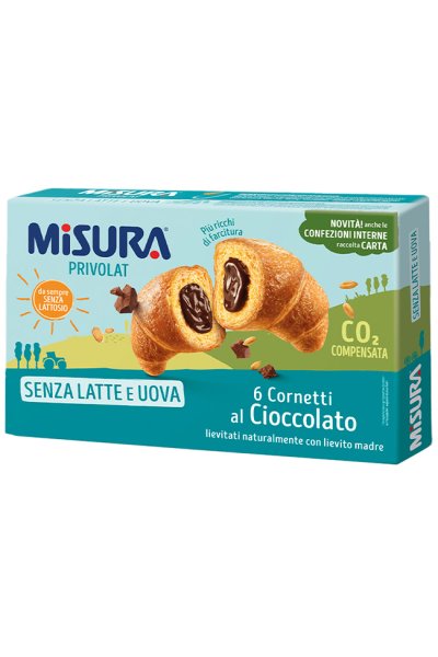 Cornetti di morbida pasta sfoglia lievitata naturalmente 16 ore con lievito madre e gustosa farcitura al cioccolato. Senza latte né uova. Adatti anche ad un'alimentazione vegana.