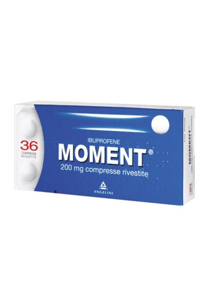 Interazioni• Sono da tenere presenti eventuali interazioni con gli anticoagulanti di tipo cumarinico: i pazienti sottoposti a trattamento con tali farmaci debbono consultare il medico prima di assumere il prodotto. È inoltre consigliabile ricorrere al consiglio del medico in caso di qualunque concomitante terapia prima della somministrazione del prodotto. • Corticosteroidi: aumento del rischio di ulcerazione o emorragia gastrointestinale (vedi sezione 4.4). • Anticoagulanti: i FANS possono aumentare gli effetti degli anticoagulanti, come il warfarin (vedi sezione 4.4). • Agenti antiaggreganti e inibitori selettivi del reuptake della serotonina (SSRIs): aumento del rischio di emorragia gastrointestinale (vedi sezione 4.4). • Diuretici, ACE inibitori e Antagonisti dell’angiotensina II: i FANS possono ridurre l’effetto dei diuretici e di altri farmaci antiipertensivi. In alcuni pazienti con funzione renale compromessa (per esempio pazienti disidratati o pazienti anziani con funzione renale compromessa) la co–somministrazione di un ACE inibitore o di un antagonista dell’angiotensina II e di agenti che inibiscono il sistema della ciclo–ossigenasi può portare a un ulteriore deterioramento della funzione renale, che comprende una possibile insufficienza renale acuta, generalmente reversibile. Queste interazioni devono essere considerate in pazienti che assumono Moment in concomitanza con ACE inibitori o antagonisti dell’angiotensina II. Quindi, la combinazione deve essere somministrata con cautela, specialmente nei pazienti anziani. • I pazienti devono essere adeguatamente idratati e deve essere preso in considerazione il monitoraggio della funzione renale dopo l’inizio della terapia concomitante. • Dati sperimentali indicano che l’ibuprofene può inibire gli effetti dell’acido acetilsalicilico a basse dosi sull’aggregazione piastrinica quando i farmaci sono somministrati in concomitanza. Tuttavia, l’esiguità dei dati e le incertezze relative alla loro applicazione alla situazione clinica non permettono di trarre delle conclusioni definitive per l’uso continuativo di ibuprofene; sembra che non vi siano effetti clinicamente rilevanti dall’uso occasionale dell’ibuprofene (vedi sezione 5.1).
