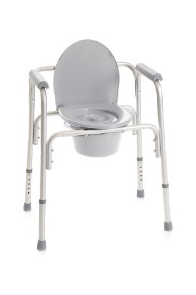 Struttura in tubo di alluminio anodizzato con confortevole seduta in polietilene, secchio e braccioli in plastica e puntali in gomma antiscivolo.Comprende quattro funzioni in una: rialzo per water, supporto per water, sedia comoda e sedile per doccia.