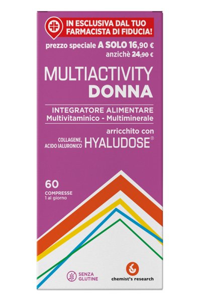 Integratore alimentare completo con vitamine, minerali e Hyaludose (complesso bilanciato di acido ialuronico e collagene), formulato in maniera specifica per sostenere i fabbisogni nutrizionali della donna.