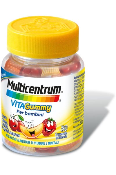 Integratore alimentare di vitamine e minerali appositamente formulato per i bambini dai 3 anni in su. La formulazione di Multicentrum VitaGummy contiene livelli ottimali di vitamina D, che contribuisce alla normale funzione del sistema immunitario, e Iodio che contribuisce alla crescita normale dei bambini.