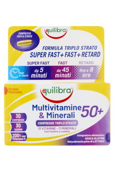 Integratore alimentare a base di vitamine e minerali in compresse triplo strato formulate con tecnologia innovativa SUPER FAST + FAST + RETARD che permette un rilascio graduale nel tempo delle vitamine e dei minerali. Formula completa studiata per le esigenze specifiche degli adulti con più di 50 anni.