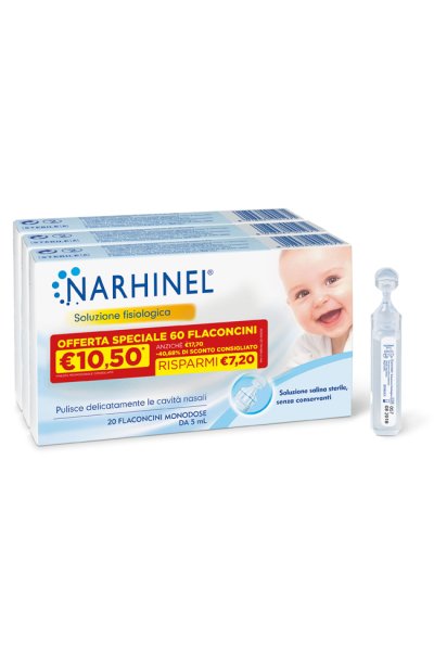 Reclinare il capo indietro e introdurre il beccuccio del flaconcino appena dentro la narice. Premere con cura il flaconcino per ottenere qualche goccia e con pià forza se è necessaria una pulizia pià accurata. Ripetere l'operazione nell'altra narice. Aspettare qualche secondo e quindi soffiare il naso se necessario. Quando utilizzata per la pulizia delle narici dei neonati e dei bambini che non sono in grado di soffiarsi il naso da soli, per rimuovere il muco usare NARHINEL Aspiratore Nasale Soft.