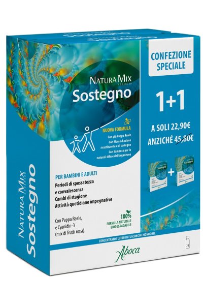 Contribuisce alla riduzione della stanchezza e dell’affaticamento e al buon funzionamento del sistema immunitario grazie alla vitamina C presente nell’estratto di acerola. Il prodotto contiene inoltre l’esclusiva pappa reale, liofilizzata a partire da 600 mg di pappa reale fresca. La formulazione è arricchita dal mix di frutti rossi Cyanidin-3, ad alto contenuto di antociani, costituito dai succhi liofilizzati di mirtillo, sambuco e mora, appositamente selezionati per la loro sinergia d’azione. In particolare, il succo liofilizzato di mirtillo svolge un’azione antiossidante e il succo liofilizzato di sambuco è utile anche per le naturali difese dell’organismo. Per queste sue caratteristiche Natura Mix Advanced Sostegno è indicato in questi casi: periodi di spossatezza e convalescenza; cambi di stagione; attività quotidiane impegnative.