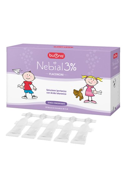 Nebial 3% flaconcini è una soluzione salina ipertonica al 3% con aggiunta di acido ialuronico pronta all'uso.