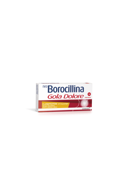 AvvertenzeAlle dosi consigliate, nell’usare il medicinale nelle sue diverse forme farmaceutiche, l’eventuale deglutizione non comporta, di per sé, alcun danno per il paziente, in quanto tali dosi sono ampiamente inferiori a quelle comunemente utilizzate nei trattamenti con il flurbiprofene per via sistemica. NEO BOROCILLINA GOLA DOLORE collutorio e NEO BOROCILLINA GOLA DOLORE spray per mucosa orale (tutte le presentazioni) contengono come conservanti metile paraidrossibenzoato e propile paraidrossibenzoato: possono causare reazioni allergiche (anche ritardate). Per la presenza di sorbitolo, i pazienti affetti da rari problemi ereditari di intolleranza al fruttosio, non devono assumere NEO BOROCILLINA GOLA DOLORE collutorio e NEO BOROCILLINA GOLA DOLORE spray per mucosa orale (tutte le presentazioni). NEO BOROCILLINA GOLA DOLORE spray (tutte le presentazioni) contiene una piccola quantità di alcool etilico inferiore a 100 mg per dose. NEO BOROCILLINA GOLA DOLORE collutorio contiene 12,15 vol % etanolo (alcool), ad es. fino a 960 mg per dose, equivalenti a circa 24 ml di birra, 10 ml di vino per dose. Può essere dannoso per gli alcolisti. Da tenere in considerazione nelle donne in gravidanza o in allattamento, nei bambini e nei gruppi ad alto rischio come le persone affette da patologie epatiche o epilessia. NEO BOROCILLINA GOLA DOLORE 0,25% spray per mucosa orale gusto arancia e miele e NEO BOROCILLINA GOLA DOLORE 0,25% spray per mucosa orale gusto limone e miele contengono anche il colorante giallo tramonto (E110), che può causare reazioni allergiche.NEO BOROCILLINA GOLA DOLORE 8,75 mg pastiglie gusto arancia e miele e NEO BOROCILLINA GOLA DOLORE 8,75 mg pastiglie gusto limone e miele contengono isomalto: i pazienti affetti da rari problemi ereditari di intolleranza al fruttosio, non devono assumere questo medicinale. In pazienti con insufficienza renale, cardiaca o epatica il medicinale NEO BOROCILLINA GOLA DOLORE deve essere utilizzato con cautela. E’ consigliato non associare il medicinale con i FANS. L’uso, specie se prolungato, del prodotto può dare origine a fenomeni di sensibilizzazione o di irritazione locale; in tali casi occorre interrompere il trattamento e consultare il medico per istituire, se necessario, una terapia idonea. Non usare per trattamenti protratti. Dopo breve periodo di trattamento senza risultati apprezzabili consultare il medico.