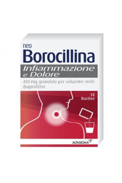 Effetti indesideratiGli effetti indesiderati osservati con ibuprofene sono generalmente comuni agli altri analgesici, antipiretici, antinfiammatori non–steroidei e sono di seguito riportati utilizzando la seguente convenzione: Molto comune (≥1/10) Comune (≥1/100, < 1/10) Non comune (≥ 1/ 1.000, < 1/100) Raro (≥1/10.000, < 1/1.000) Molto raro (<1/10.000). Non nota (la frequenza non può essere definita sulla base dei dati disponibili) Gli eventi avversi più comunemente osservati sono di natura gastrointestinale. Patologie gastrointestinali Possono verificarsi ulcere peptiche, perforazione o emorragia gastrointestinale, a volte fatale, in particolare negli anziani (vedere paragrafo 4.4). La perforazione gastrointestinale con l’uso di ibuprofene è stata osservata raramente. Dopo somministrazione di Neo Borocillina Infiammazione e Dolore sono stati riportati: sensazione di pesantezza allo stomaco, nausea, vomito, diarrea, flatulenza, costipazione, dispepsia, dolore epigastrico, pirosi gastrica, dolore addominale, melena, ematemesi, stomatiti ulcerative, esacerbazione di colite e morbo di Crohn (vedere paragrafo 4.4). Non comune: gastriti. Molto raro: pancreatiti. Disturbi del sistema immunitario In seguito a trattamento con FANS sono state riportati i seguenti effetti indesiderati: reazione allergica non–specifica e anafilassi; non comune: reazioni da ipersensibilità come eruzione cutanea di vario tipo, orticaria, prurito, porpora, angioedema, esantema, reazioni a carico del tratto respiratorio comprendenti broncospasmo, dispnea, attacco asmatico (talvolta con ipotensione); raro: sindrome da lupus eritematoso; molto raro: gravi reazioni di ipersensibilità. I sintomi possono includere: asma grave, edema del volto, edema della lingua, edema della laringe, edema delle vie aeree con broncospasmo, dispnea, tachicardia, anafilassi, dermatiti esfoliative e bollose. Patologie cardiache e vascolari Studi clinici suggeriscono che l’uso di ibuprofene, specialmente ad alti dosi (2400 mg/die) può essere associato ad un modesto aumento del rischio di eventi trombotici arteriosi (es. infarto del miocardio o ictus) (vedere paragrafo 4.4). Molto raro: palpitazioni, insufficienza cardiaca, infarto del miocardio, edema polmonare acuto, ipertensione. Altri eventi avversi per i quali non è stata necessariamente stabilita una causalità includono: Patologie del sistema emolinfopoietico Raro: leucopenia, trombocitopenia, neutropenia, agranulocitosi, anemia aplastica e anemia emolitica, inibizione dell’aggregazione piastrinica. Disturbi psichiatrici Non comune: insonnia, ansia Raro: depressione, stato confusionale, allucinazioni. Patologie del sistema nervoso Comune: capogiro. Non comune: parestesia, sonnolenza. Raro: neurite ottica. Infezioni e infestazioni Non comune: rinite. Raro: meningite asettica. Rinite e meningite asettica sono stati osservati specialmente in pazienti con preesistenti disordini autoimmuni, (come lupus eritematoso sistemico e connettivite mista) con sintomi di rigidità nucale, mal di testa, nausea, vomito, febbre o disorientamento (vedere paragrafo 4.4). È stata descritta l’esacerbazione di infiammazioni infezione–correlate (ad es. sviluppo di fascite necrotizzante). Patologie dell’apparato respiratorio Non comune: broncospasmo, dispnea, apnea. Patologie dell’occhio Non comune: disturbi visivi. Raro: alterazione oculare con conseguenti disturbi visivi, neuropatia ottica tossica. Patologie dell’orecchio e del labirinto Non comune: udito compromesso, tinnito, vertigine. Patologie epatobiliari Non comune: funzione epatica anormale, epatite e ittero. Molto raro: insufficienza epatica. Patologie della cute e del tessuto sottocutaneo Talvolta si possono verificare eruzioni cutanee su base allergica (eritemi, prurito, orticaria). Non comune: reazioni di fotosensibilità Molto raro: dermatiti bollose, incluse sindrome di Stevens–Johnson, necrolisi tossica epidermica ed eritema multiforme. In casi eccezionali, gravi infezioni della cute e patologie dei tessuti molli possono verificarsi durante l’infezione da varicella (vedere "infezioni e infestazioni"). Patologie renali e urinarie Non comune: funzione renale alterata e nefropatia tossica in varie forme, incluse nefrite interstiziale, sindrome nefrosica ed insufficienza renale. Raro:iperazotemia. Patologie sistemiche e condizioni relative alla sede di somministrazione Comune: malessere, affaticamento. Raro: edema. Esami diagnostici Raro: transaminasi aumentate, fosfatasi alcalina aumentata, emoglobina ridotta, ematocrito ridotto, tempo di sanguinamento prolungato, calcio ematico diminuito, acido urico ematico aumentato. Segnalazione delle reazioni avverse sospette La segnalazione delle reazioni avverse sospette che si verificano dopo l’autorizzazione del medicinale è importante, in quanto permette un monitoraggio continuo del rapporto beneficio/rischio del medicinale. Agli operatori sanitari è richiesto di segnalare qualsiasi reazione avversa sospetta tramite il sistema nazionale di segnalazione all’indirizzo www.agenziafarmaco.gov.it/it/responsabili.