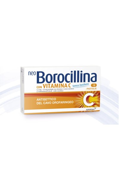AvvertenzeLe pastiglie di Neo Borocillina senza zucchero contengono vitamina C, pertanto devono essere usate con cautela da soggetti che soffrono, o abbiano sofferto in passato, di nefrolitiasi (calcolosi renale) e da quelli affetti da Deficit di G6PD (Glucosio–6–fostato deidrogenasi), emocromatosi, talassemia o anemia sideroblastica. Il prodotto non contiene saccarosio, può quindi essere assunto da chi deve evitare la somministrazione di tale zucchero. L’impiego, specie se prolungato, dei prodotti per uso topico orale può dare origine a fenomeni di sensibilizzazione. In tal caso è necessario interrompere il trattamento e consultare il medico ai fini della istituzione di eventuale idonea terapia. Dopo breve periodo di trattamento senza risultati apprezzabili, consultare il medico. TENERE FUORI DALLA PORTATA E DALLA VISTA DEI BAMBINI.