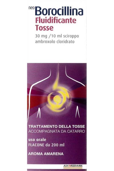 AvvertenzeNeo Borocillina Fluidificante Tosse 30 mg / 10 ml sciroppo contiene sorbitolo: i pazienti affetti da rari problemi ereditari di intolleranza al fruttosio non devono assumere questo medicinale. L’ambroxolo cloridrato deve essere somministrato con cautela nei pazienti affetti da ulcera peptica. I mucolitici possono indurre ostruzione bronchiale nei bambini di età inferiore ai 2 anni. Infatti la capacità di drenaggio del muco bronchiale è limitata in questa fascia d’età, a causa delle caratteristiche fisiologiche delle vie respiratorie. Essi non devono quindi essere usati nei bambini di età inferiore ai 2 anni (vedere paragrafo 4.3). Sono stati segnalati casi di reazioni cutanee gravi quali eritema multiforme, sindrome di Stevens–Johnson (SJS)/necrolisi epidermica tossica (TEN) e pustolosi esantematica acuta generalizzata (AGEP) associati alla somministrazione di ambroxolo. Se sono presenti sintomi o segni di rash cutaneo progressivo (talvolta associato a vesciche o lesioni della mucosa), il trattamento con ambroxolo deve essere interrotto immediatamente e deve essere consultato un medico. Inoltre, nella fase iniziale della Sindrome di Stevens–Johnson o della TEN, i pazienti potrebbero inizialmente avvertire dei sintomi non specifici simili a quelli dell’influenza, come per esempio febbre, malessere, rinite, tosse e mal di gola. A causa di questi sintomi fuorvianti è possibile che venga intrapreso un trattamento sintomatico con una terapia per la tosse ed il raffreddore. In caso di insufficienza renale lieve o moderata, Neo Borocillina Fluidificante Tosse può essere usato solo dopo aver consultato il medico. Come per ogni medicinale con metabolismo epatico seguito da escrezione renale, l’accumulo dei metaboliti dell’ambroxolo a livello epatico è prevedibile in presenza di insufficienza renale severa.