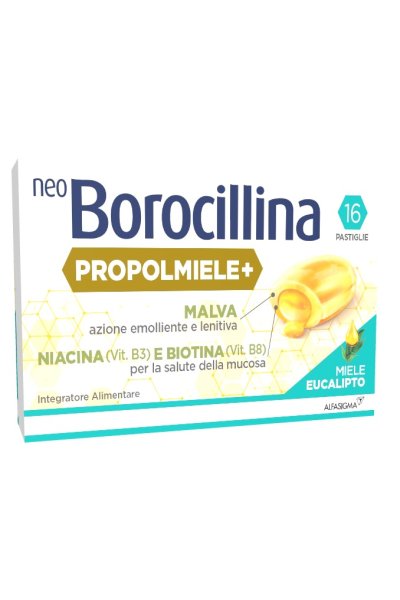 NeoBorocillina propolmiele+ è la pastiglia dal cuore liquido, nata dalla ricerca neoBorocillina, per il benessere della gola. La sua formulazione, con un cuore liquido a base di propoli e miele, è pensata per una doppia azione: favorisce il benessere della gola grazie all’azione emolliente e lenitiva della malva e aiuta la salute della mucosa grazie all’azione delle vitamine niacina (Vitamina B3) e biotina (Vitamina B8). Senza coloranti.