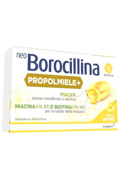 NeoBorocillina propolmiele+ è la pastiglia dal cuore liquido, nata dalla ricerca neoBorocillina, per il benessere della gola. La sua formulazione, con un cuore liquido a base di propoli e miele, è pensata per una doppia azione: favorisce il benessere della gola grazie all’azione emolliente e lenitiva della malva e aiuta la salute della mucosa grazie all’azione delle vitamine niacina (Vitamina B3) e biotina (Vitamina B8). Senza coloranti.
