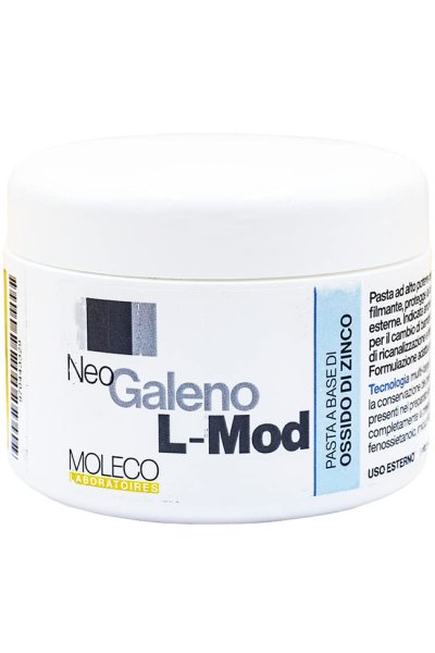 Pasta con ossido di zinco. NeoGaleno L-Mod è una pasta di Lassar modificata e aggiornata, protettiva anidra con ossido di zinco, a base di burro di karité ad alto potere coprente, isolante e filmante.