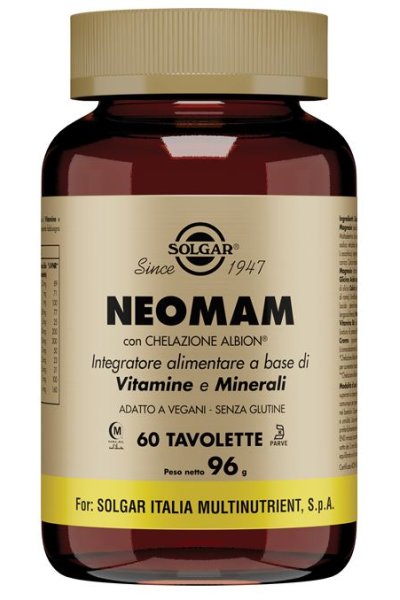 Integratore alimentare contenente ben 24 nutrienti tra vitamine e minerali opportunamente dosati secondo i VNR* specifici per la donna in gravidanza. NEOMAM può essere utilizzato anche durante l'allattamento a completamento di un'alimentazione che dev'essere comunque il più variata possibile. NEOMAM contiene tra gli altri nutrienti acido folico e iodio, nutrienti raccomandati dall'Organizzazione Mondiale della Sanità. In particolare, l'assunzione integrativa di acido folico aumenta lo stato del folato materno. Un basso stato del folato materno è un fattore di rischio per lo sviluppo di difetti del tubo neurale del feto. NEOMAM fornisce inoltre ferro bisglicinato, un minerale scelto in una forma biochimica brevettata, facilmente assimilabile e digeribile. La formula è arricchita con calcio, beta-carotene ed altri importanti elementi nutritivi come cromo, selenio spesso mancanti nelle formule prenatali.