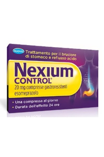 PosologiaPosologia La dose raccomandata è di 20 mg di esomeprazolo (una compressa) al giorno. Potrebbe essere necessario assumere le compresse per 2-3 giorni consecutivi per ottenere il miglioramento dei sintomi. La durata del trattamento è fino a 2 settimane. Una volta ottenuta la completa scomparsa dei sintomi, il trattamento deve essere interrotto. Se non si ottiene la risoluzione dei sintomi entro 2 settimane di trattamento continuo, il paziente deve consultare un medico. Popolazioni particolari Pazienti con compromissione renale Non è necessario un aggiustamento della dose nei pazienti con funzione renale compromessa. Data la limitata esperienza in pazienti con grave insufficienza renale, tali pazienti devono essere trattati con cautela (vedere paragrafo 5.2). Pazienti con compromissione epatica Non è necessario un aggiustamento della dose nei pazienti con compromissione epatica lieve o moderata. Tuttavia, i pazienti con compromissione epatica grave devono essere consigliati da un medico prima di assumere Nexium Control (vedere paragrafo 4.4 e 5.2). Pazienti anziani (≥65 anni) Non è necessario un aggiustamento della dose nei pazienti anziani. Popolazione pediatrica Non esiste alcuna indicazione per un uso specifico di Nexium Control nella popolazione pediatrica di età inferiore a 18 anni per l’indicazione "trattamento a breve termine dei sintomi da reflusso (es. pirosi e rigurgito acido)". Modo di somministrazione Le compresse devono essere deglutite intere con mezzo bicchiere di acqua. Le compresse non devono essere masticate o frantumate.In alternativa la compressa può essere dispersa in mezzo bicchiere di acqua non gassata. Non devono essere usati altri liquidi in quanto il rivestimento gastroresistente si potrebbe dissolvere. L’acqua deve essere mescolata fino a disperdere la compressa. Il liquido con i granuli deve essere bevuto immediatamente o entro 30 minuti. Il bicchiere deve essere sciacquato con mezzo bicchiere di acqua e l’acqua bevuta. I granuli non devono essere masticati o frantumati.