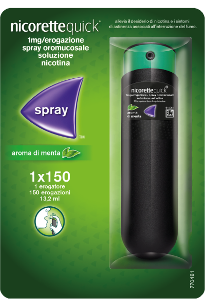 PosologiaPosologia I soggetti devono smettere di fumare completamente durante il trattamento con Nicorettequick. Adulti e anziani Il grafico seguente illustra la tempistica di utilizzo raccomandata per lo spray oromucosale durante il trattamento completo (fase I) e nelle fasi di riduzione (fase II e fase III). È possibile utilizzare fino a 4 erogazioni ogni ora. Non superare 2 erogazioni per ciascun dosaggio e 64 erogazioni (4 erogazioni ogni ora nell’arco di 16 ore) in un periodo di 24 ore. Fase I: settimane da 1 a 6 Utilizzare 1 o 2 erogazioni quando si sarebbe fumata una sigaretta oppure se si riscontra il desiderio di fumare. Se una sola erogazione non consente di controllare il desiderio di fumare entro pochi minuti, erogare una seconda erogazione. Se sono necessarie 2 erogazioni, in futuro sarà possibile erogare 2 erogazioni consecutive. La maggior parte dei fumatori avrà bisogno di 1 o 2 erogazioni ogni 30 minuti o 1 ora. Fase II: settimane da 7 a 9 Iniziare a ridurre il numero di erogazioni giornaliere. Entro la fine della settimana 9, i soggetti devono aver DIMEZZATO il numero medio di erogazioni giornaliere utilizzati nella fase I. Fase III: settimane da 10 a 12 Continuare a ridurre il numero di erogazioni giornaliere in modo che, nella settimana 12, i soggetti non utilizzino più di 4 erogazioni al giorno. Quando i soggetti hanno ridotto il numero di erogazioni a 2–4 al giorno,si deve interrompere l’utilizzo dello spray oromucosale. Esempio: se in media si fumano 15 sigarette al giorno, devono essere utilizzati 1–2 erogazioni almeno 15 volte nel corso della giornata. Come ausilio per proseguire l’interruzione del fumo dopo la fase III, i soggetti possono continuare a utilizzare lo spray oromucosale nelle situazioni in cui sono fortemente tentati di fumare. È possibile utilizzare una sola erogazione nelle situazioni in cui si avverte l’urgenza di fumare, con una seconda erogazione se la prima non ha sortito alcun effetto entro alcuni minuti. In questa fase, non si devono utilizzare più di quattro erogazioni al giorno. Generalmente si sconsiglia l’uso regolare dello spray oromucosale oltre i 6 mesi. Alcuni ex fumatori possono avere bisogno di un trattamento più lungo con lo spray oromucosale per evitare di riprendere a fumare. Lo spray oromucosale residuo deve essere conservato per l’utilizzo in caso di improvviso desiderio di fumare. Popolazione pediatrica Non somministrare Nicorettequick a soggetti di età inferiore ai 18 anni. Non si ha esperienza nel trattamento di adolescenti di età inferiore a 18 anni con Nicorettequick. Metodo di somministrazione Dopo la preparazione, puntare il beccuccio spray quanto più possibile vicino alla bocca. Premere con fermezza la parte superiore del dosatore e rilasciare un’erogazione all’interno della bocca, evitando le labbra. I soggetti non devono inalare durante l’erogazione, per evitare che lo spray venga nebulizzato nelle vie respiratorie. Per risultati ottimali, non deglutire per alcuni secondi dopo l’erogazione. I soggetti non devono assumere cibo o bevande contemporaneamente all’assunzione dello spray oromucosale. Generalmente il supporto e la terapia comportamentale aumentano la percentuale di successo.