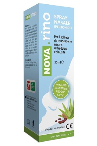 Nova.rino Spray è un dispositivo medico a base di acido ialuronico, Xilogel (polisaccaridi semi di tamarindo) e aloe. Nova.rino Spray è una soluzione salina ipertonica al 3%, coadiuvata da acido ialuronico, Xilogel e aloe, con azione drenante del muco nasale, indicata in caso di raffreddore, sinusite e congestione nasale.